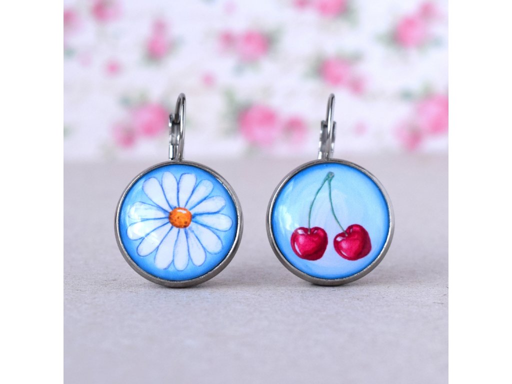 Visací náušnice s letním motivem třešní a kopretin. Motiv je chráněn průsvitnou a vysoce lesklou epoxy vrstvou