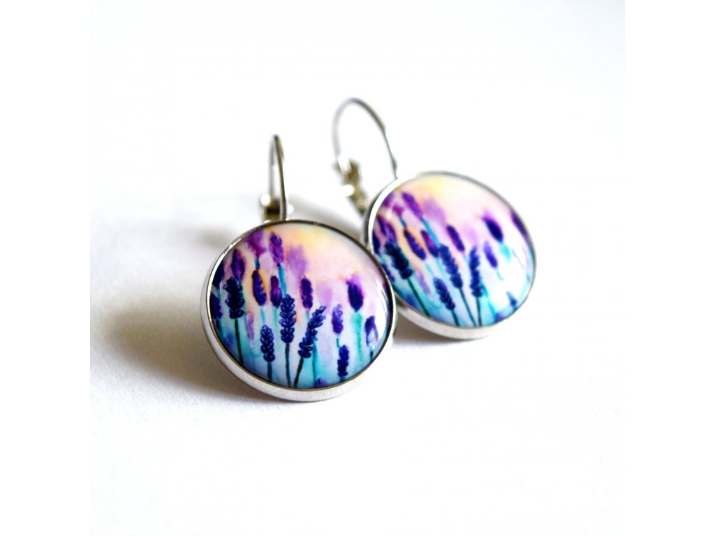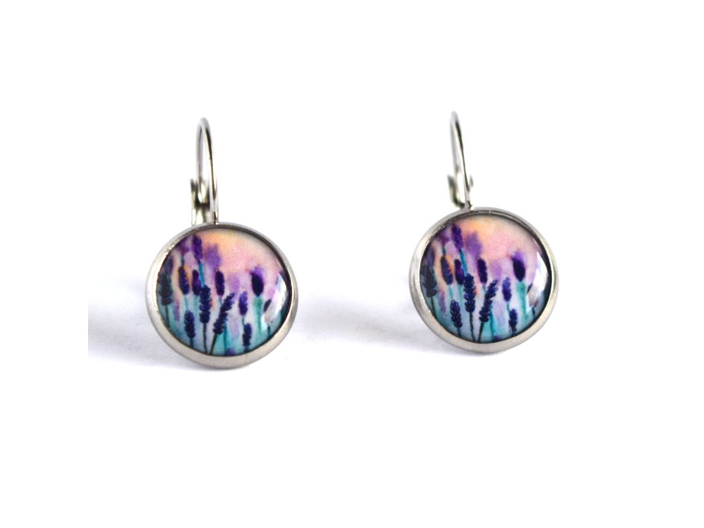 Visací náušnice na uzavíratelné zapínání. Tvoří je můj autorský motiv levandulového pole.