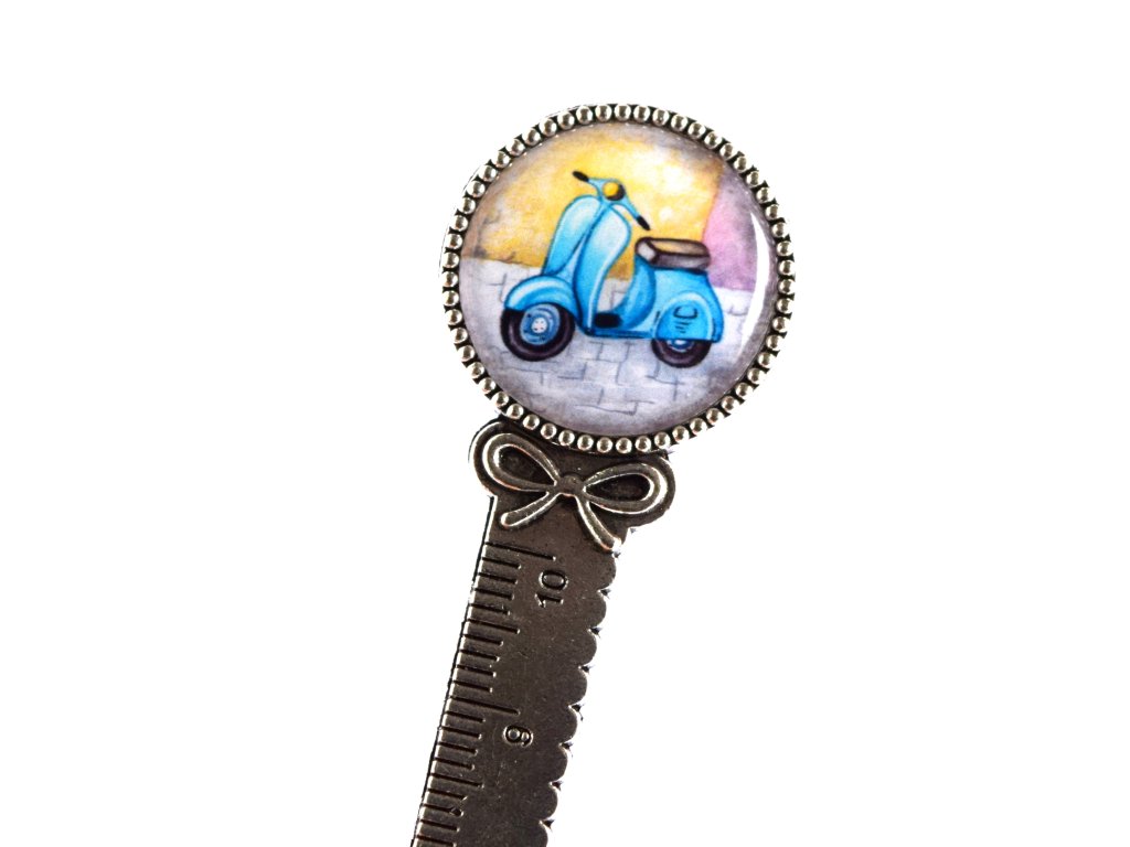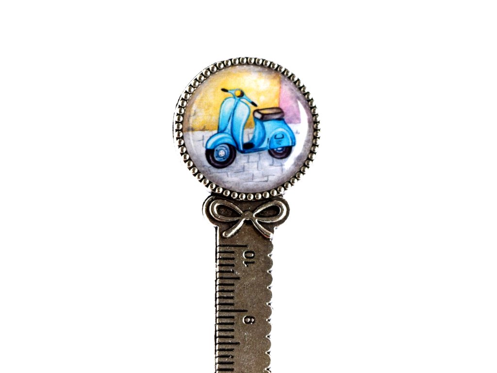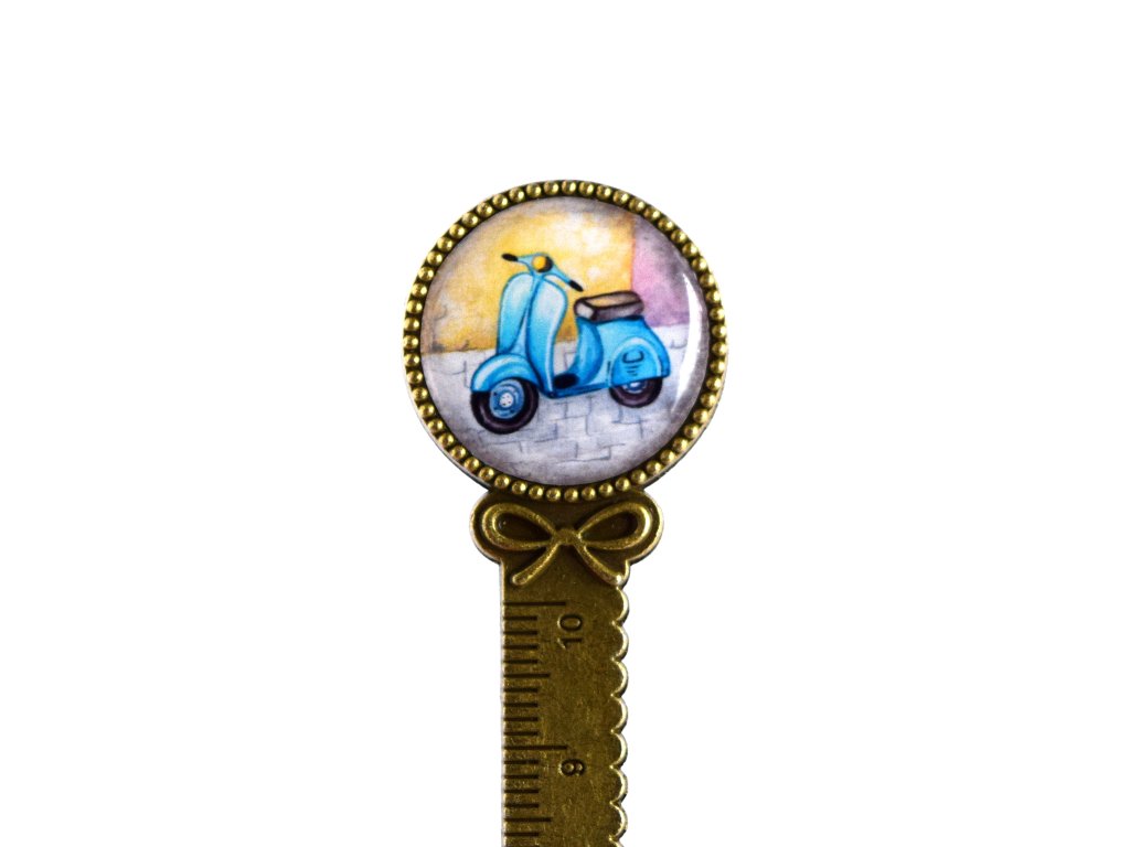 Záložka s motivem motorky ve stylu Vespy. Motiv je chráněn vysoce lesklou epoxy vrstvou.