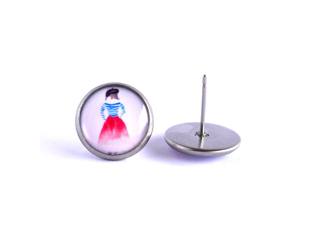 Náušnice-pecky s obrázkem ženy v pruhovaném triku. Motiv je chráněn průsvitnou a vysoce lesklou epoxy vrstvou.