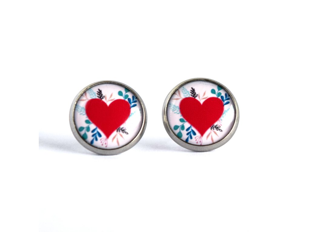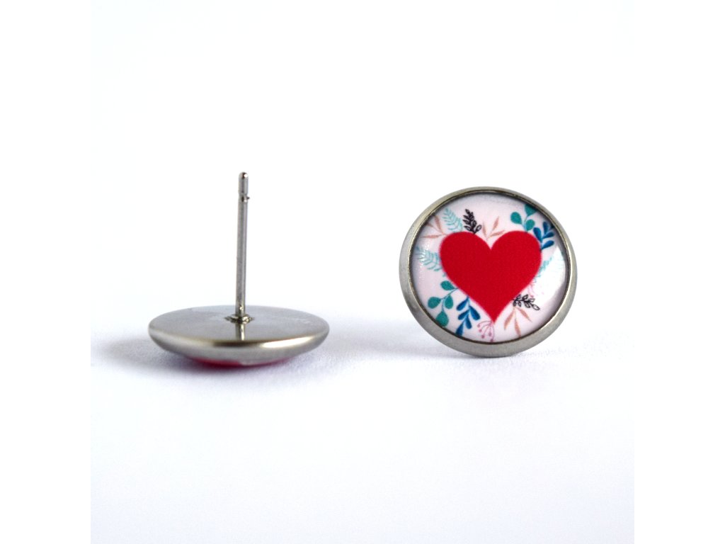 Náušnice-pecky s obrázkem srdce a květinovým motivem. Chráněno průsvitnou a vysoce lesklou epoxy vrstvou.