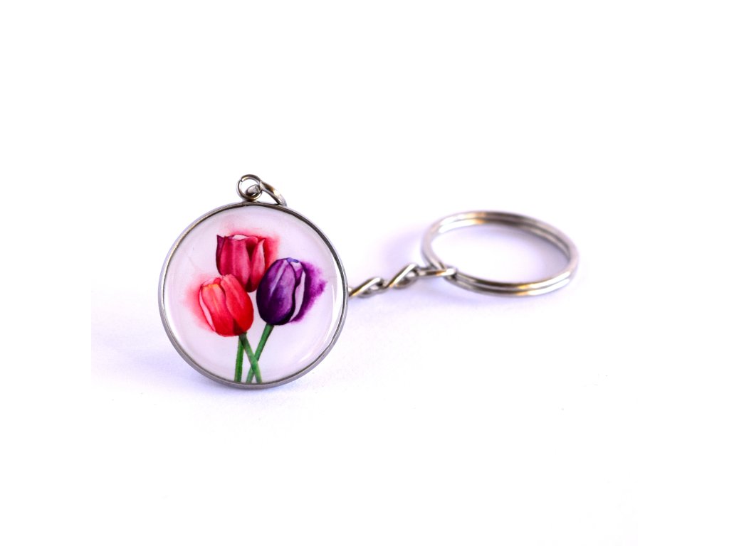 Přívěsek na klíče s tulipány malovanými akvarelem.